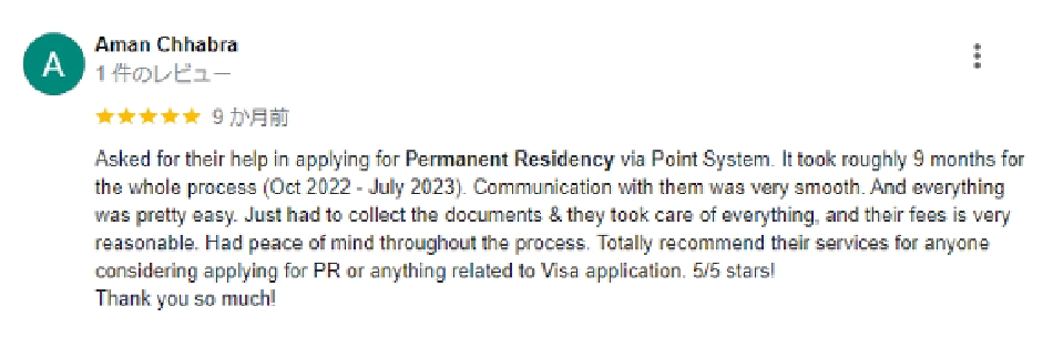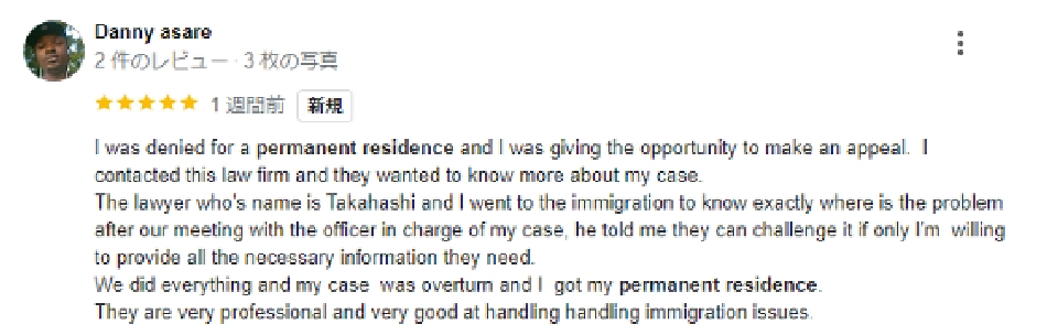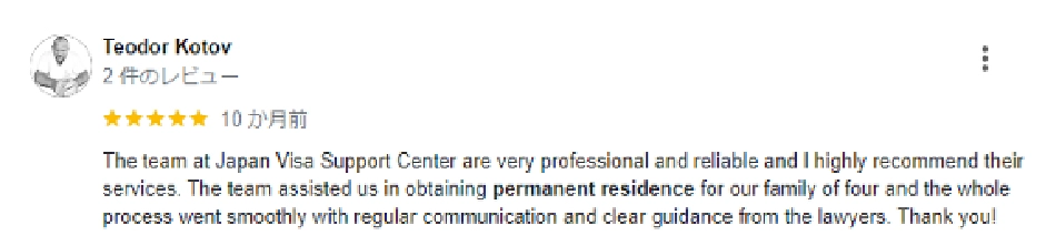 JAPAN VISA SUPPORTと一緒に永住権の取得に成功したご依頼人様から頂戴したGoogleの口コミ(レビュー)を紹介します。