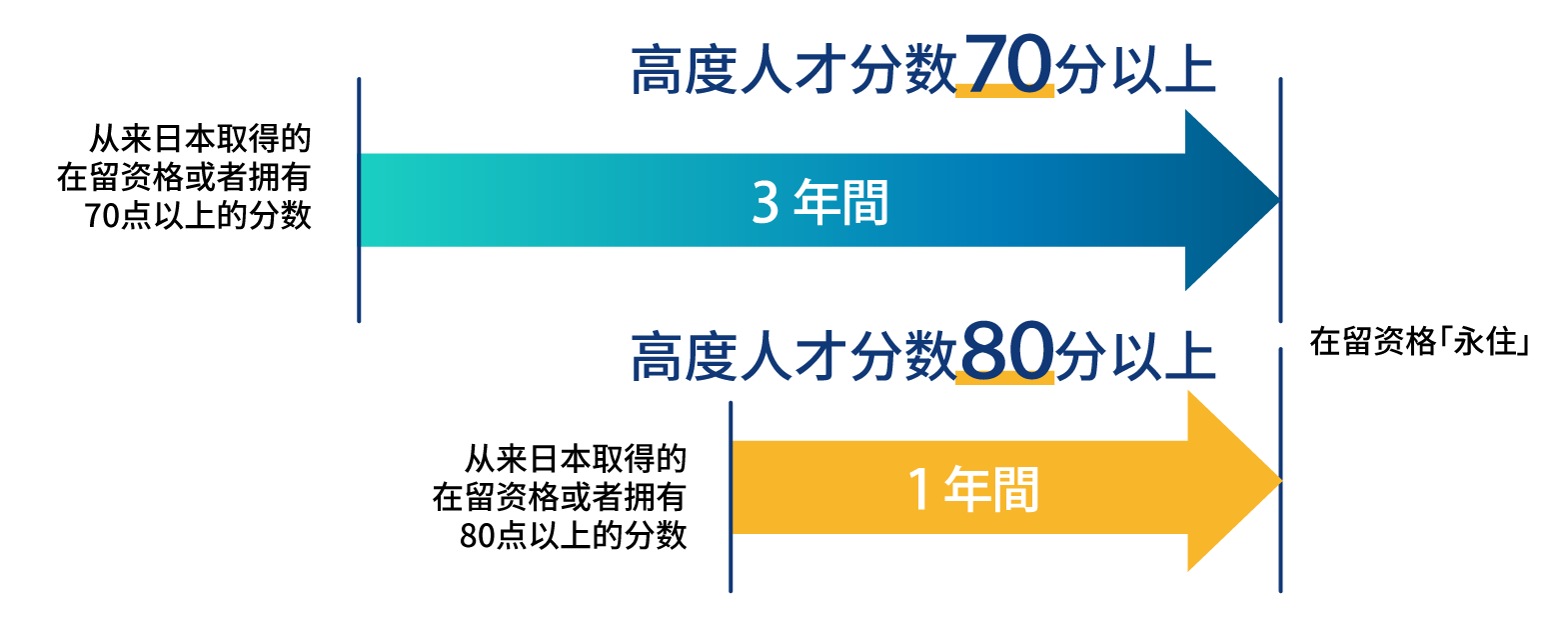 ※客户如果是就劳签证的话,即使没有高度专门职的签证,只要满足分数的要求,就可以比上面所记的就劳签证的时长要短。